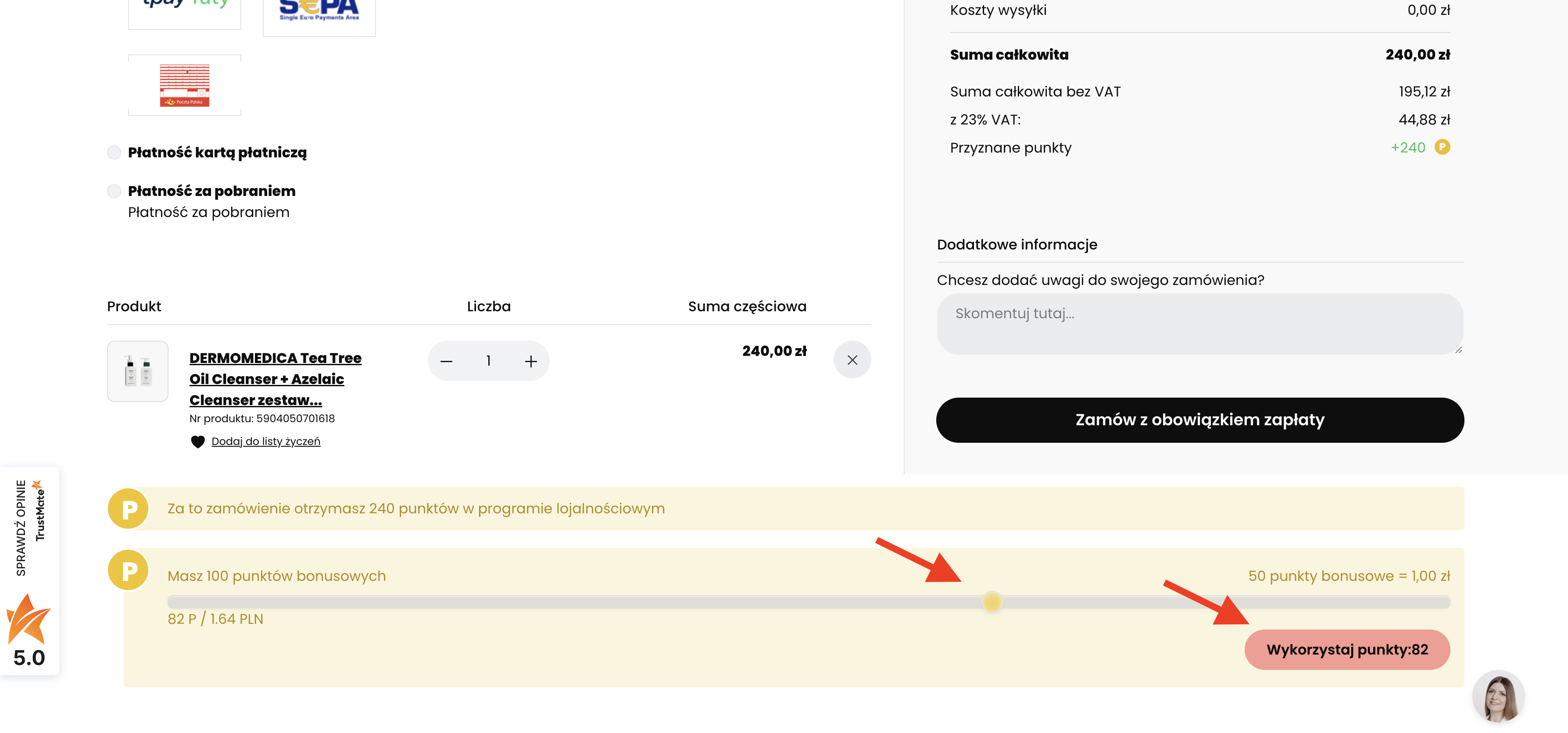 Po przejściu do kasy na dole strony znajduje się suwak z punktami do wykorzystania. Należy przeciągnąć suwak, aby wykorzystać określoną liczbę punktów, a następnie kliknąć przycisk "Wykorzystaj punkty":